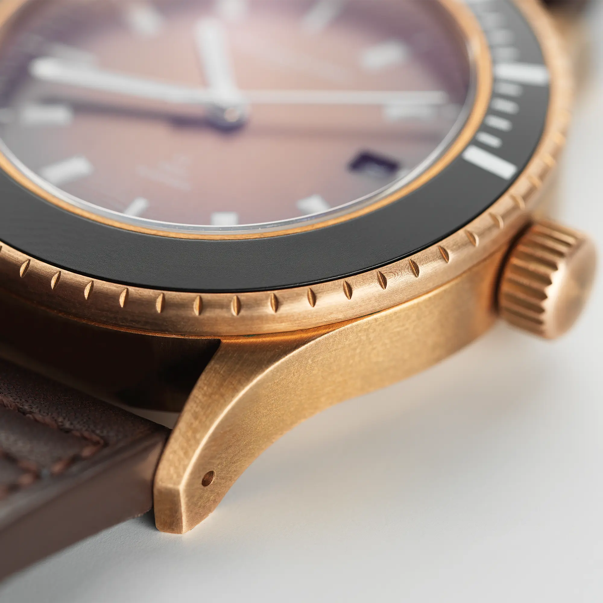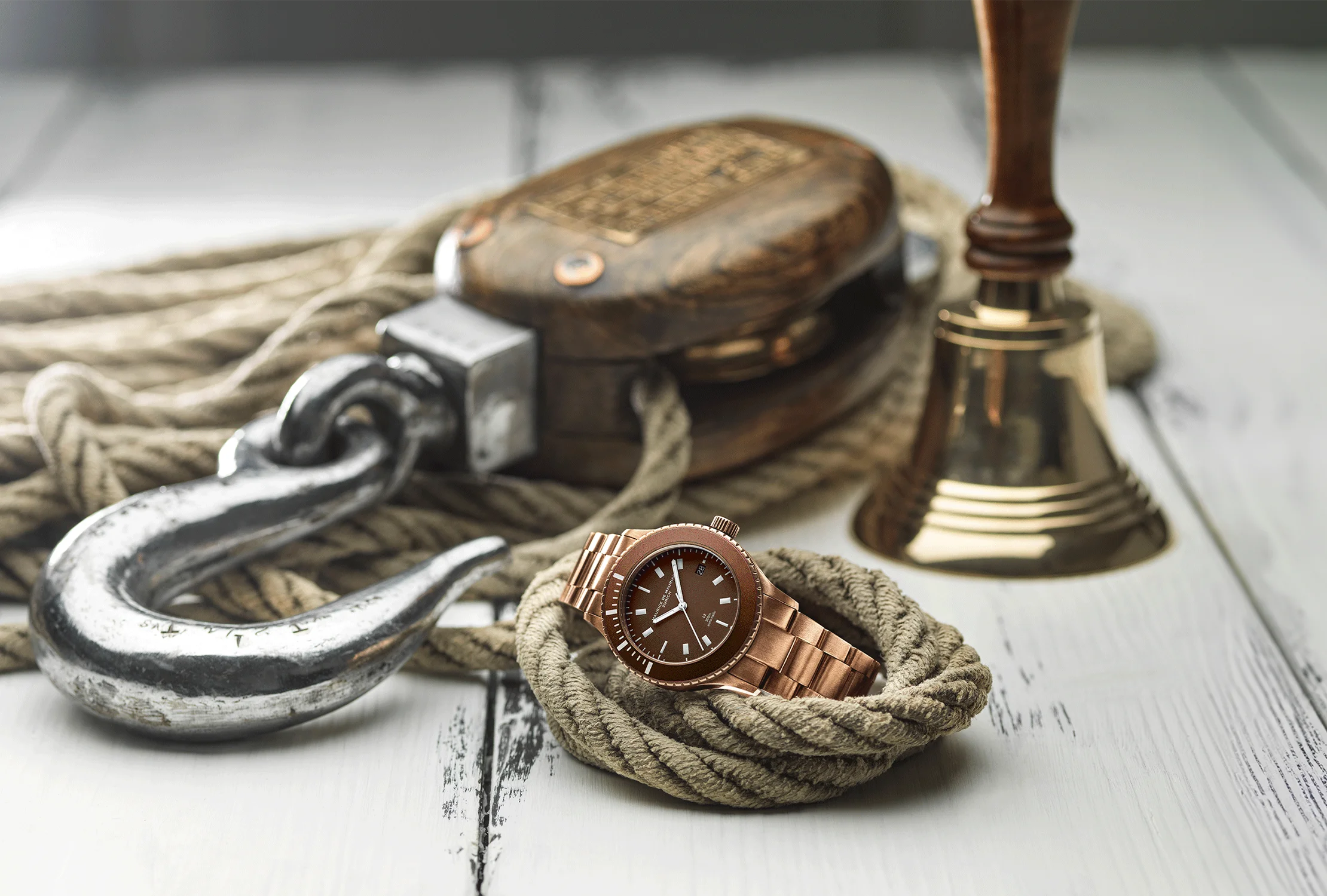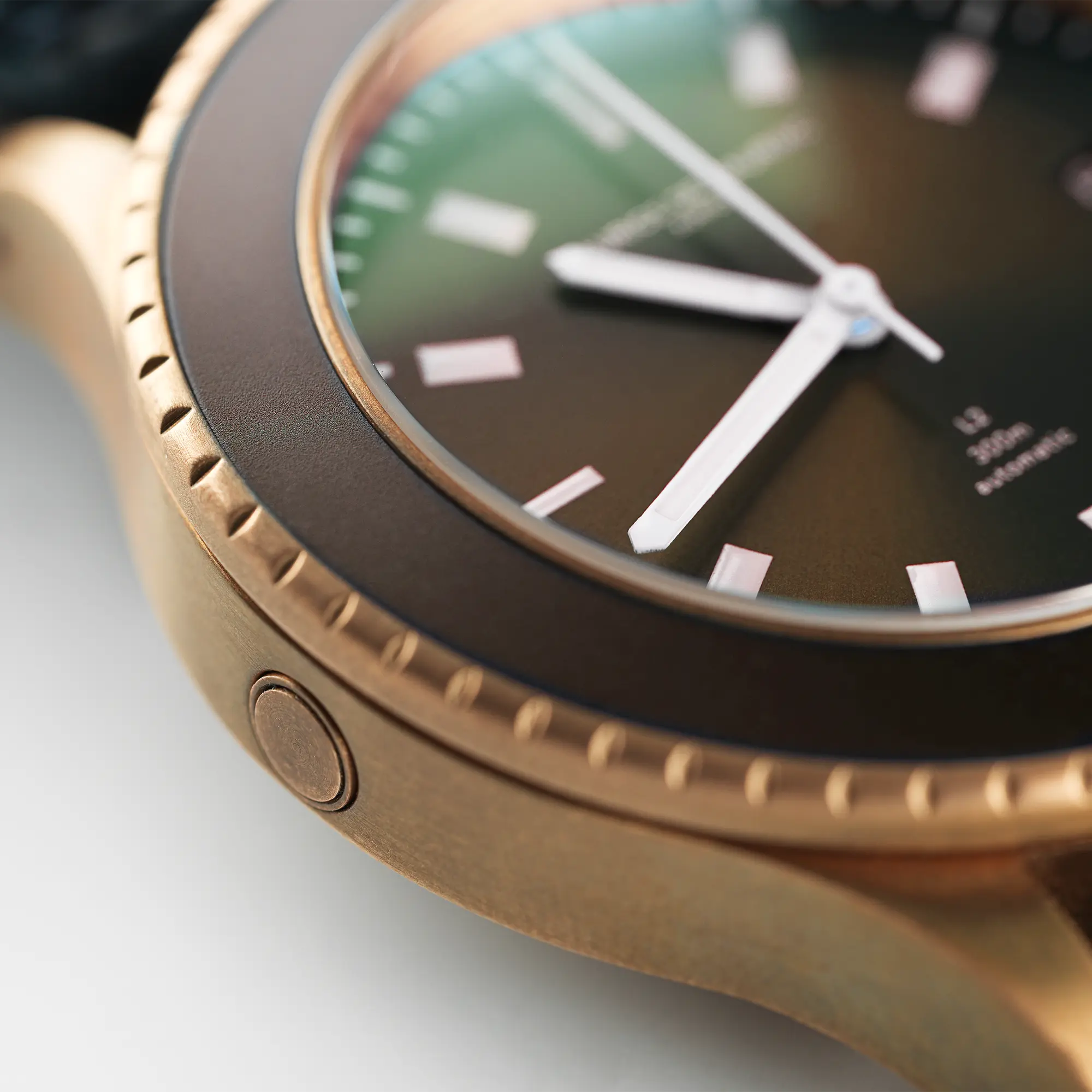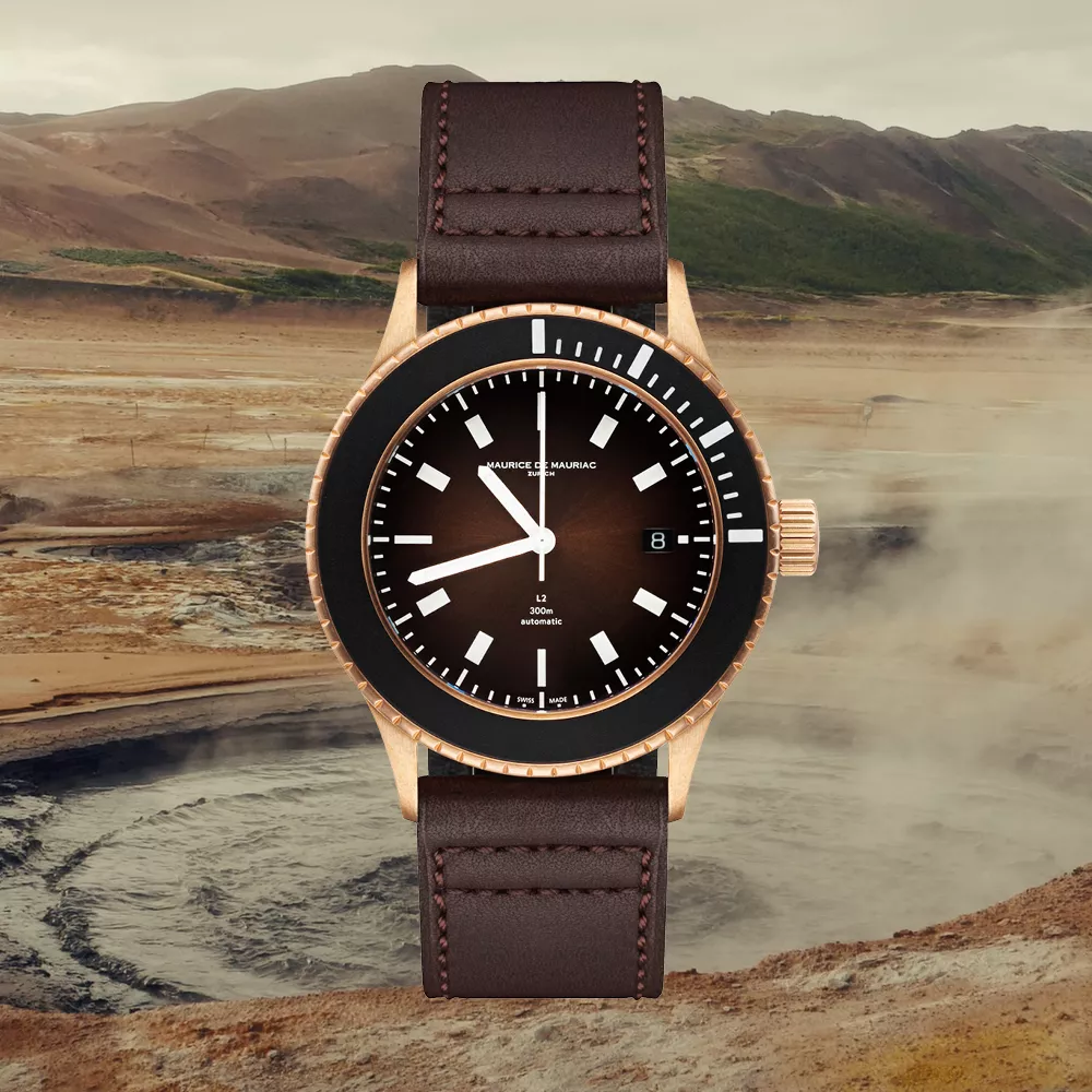 Ein erdiges Braun, wie man es bei manchen frisch gepflügten Feldern findet trifft hier auf Bronze, die älteste von Menschen geschaffene Metalllegierung. Das alles braucht Wasser. Die Bronze ist gleichsam auch perfekt gegen Wasser, denn die Bronze schützt sich selbst und macht sich unangreifbar gegen Wasser. Dazu passen 300 Meter Wasserdichtigkeit. Die L2 deep brown Bronze misst auch die Zeit, die wir die Luft atmen, vom ersten bis zum letzten Atemzug. Eine die lebt!