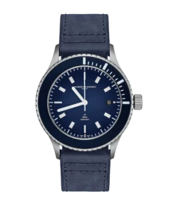“Die 42mm ‘L2’ Uhr von Maurice de Mauriac ist für Taucher optimiert. Das DLC-beschichtete Edelstahlgehäuse ist mit einem Heliumablassventil ausgestattet, um die interne Stromquelle ETA 28.24-2 auch bei 30 bar unter der Wasseroberfläche zu schützen. Auf der Rückseite dieses in der Schweiz hergestellten Stückes ist ein Seelöwe eingraviert – eine passende Anpassung an das Maskottchen der Stadt Zürich, den Löwen.”