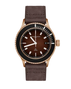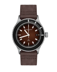 “Die 42mm ‘L2’ Uhr von Maurice de Mauriac ist für Taucher optimiert. Das DLC-beschichtete Edelstahlgehäuse ist mit einem Heliumablassventil ausgestattet, um die interne Stromquelle ETA 28.24-2 auch bei 30 bar unter der Wasseroberfläche zu schützen. Auf der Rückseite dieses in der Schweiz hergestellten Stückes ist ein Seelöwe eingraviert – eine passende Anpassung an das Maskottchen der Stadt Zürich, den Löwen.”