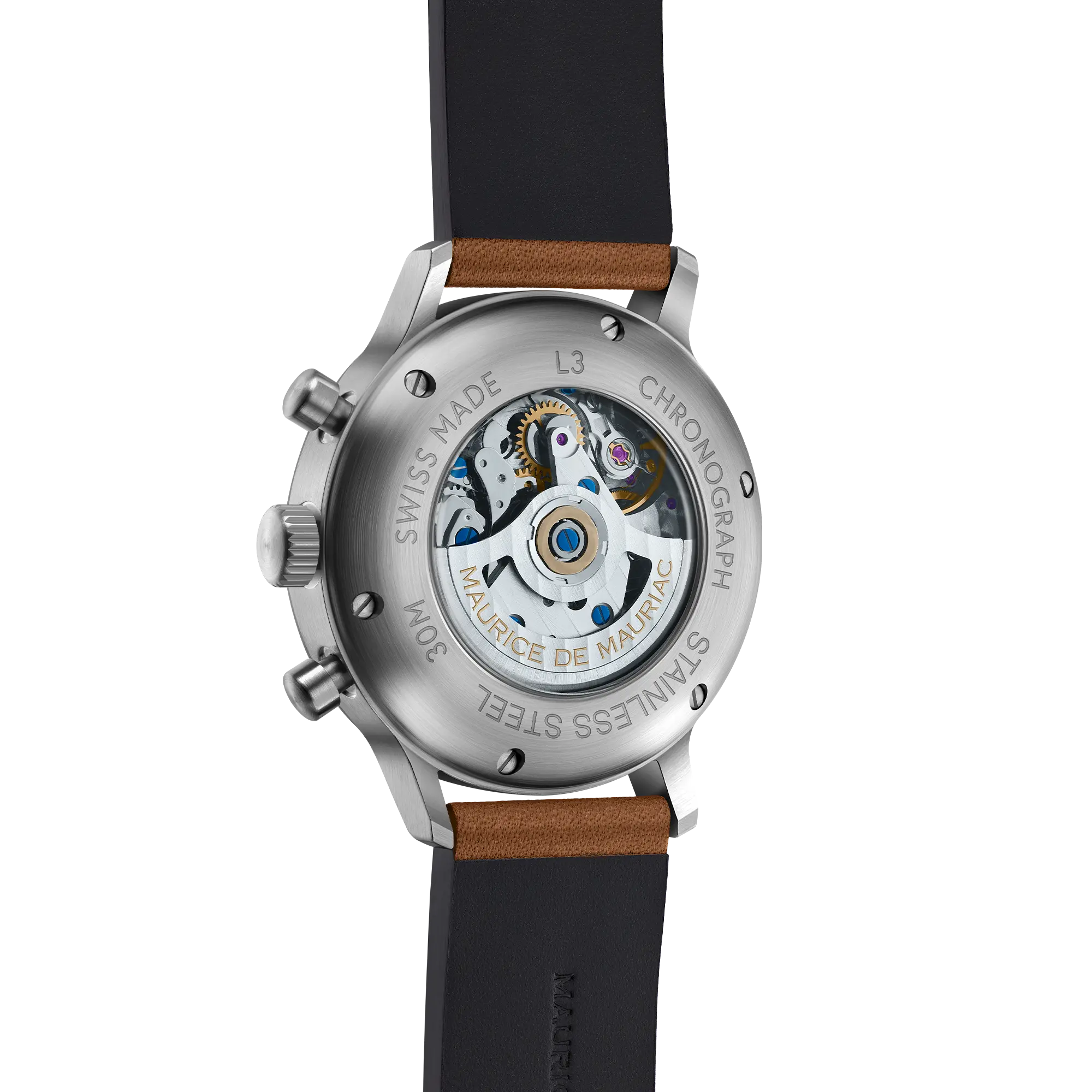“Die Zürcher Schule der Konkreten hat Schwaerzler ebenso inspiriert, wie Klassiker dieses Uhrentyps, um sich von dort in gerader Linie weiter zu entwickeln – die L(inien)-Serie zu vollenden. Sie ist eine Klasse für sich geworden und damit würdiger Teil des Uhren-Triptychons der L-Serie. Wir nennen sie eine Cuff Watch, weil sie Manschette und Anzugärmel mit geringer Gehäusehöhe und hoch gewölbtem Glas sanft streicht”