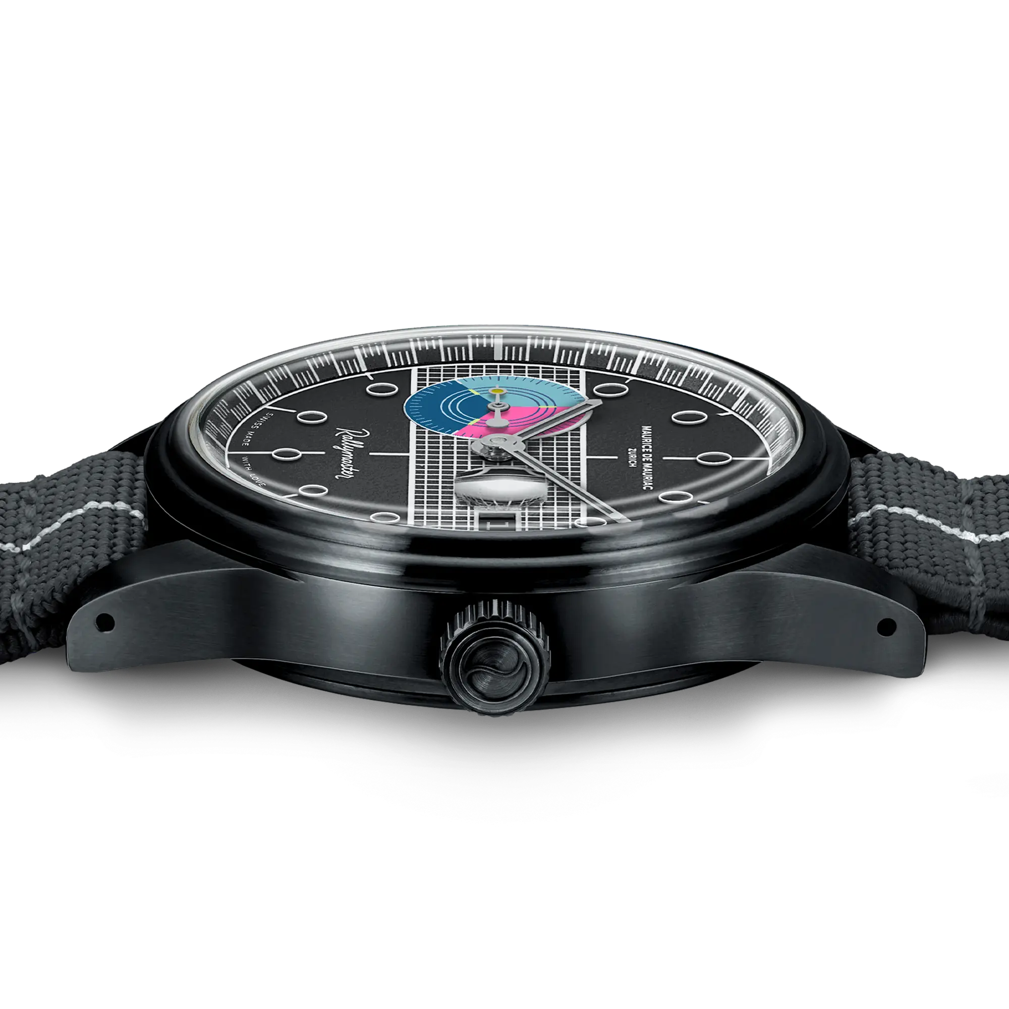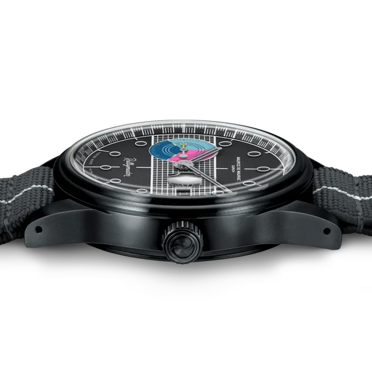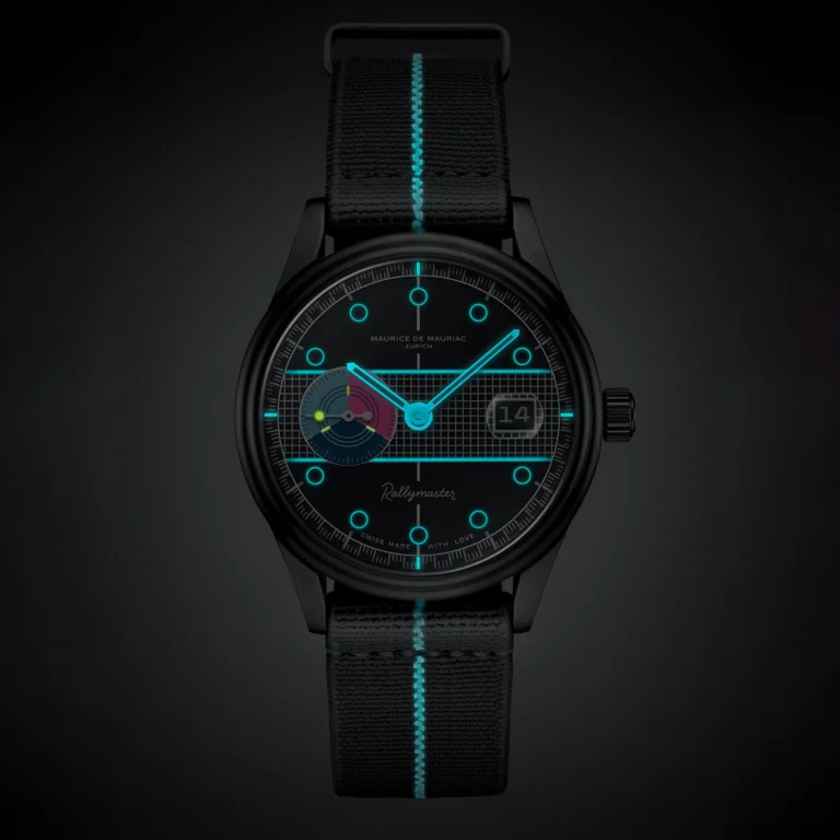 The serrated bezel stands for resilience, reducing glare under extreme conditions; the heat-resistant textile strap is made for dust, heat, and constant movement. Sapphire crystal with double-sided anti-reflective coating, 100 metres of water resistance, and a robust stainless-steel case make this watch a companion that doesn’t ask questions — it simply goes with you.
